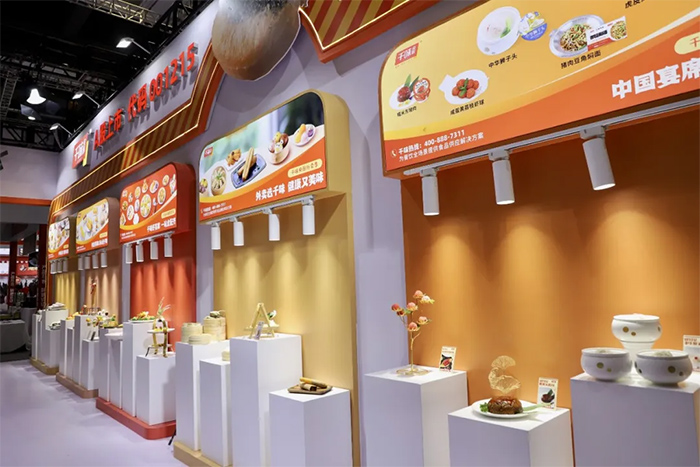 琳瑯滿目的產品展臺由千味央廚專業的廚務團隊打造,圍繞早餐、團餐、宴席、外賣四大場景,出品形式還原實際應用場景,帶給現場觀眾更加直觀的產品應用體驗。